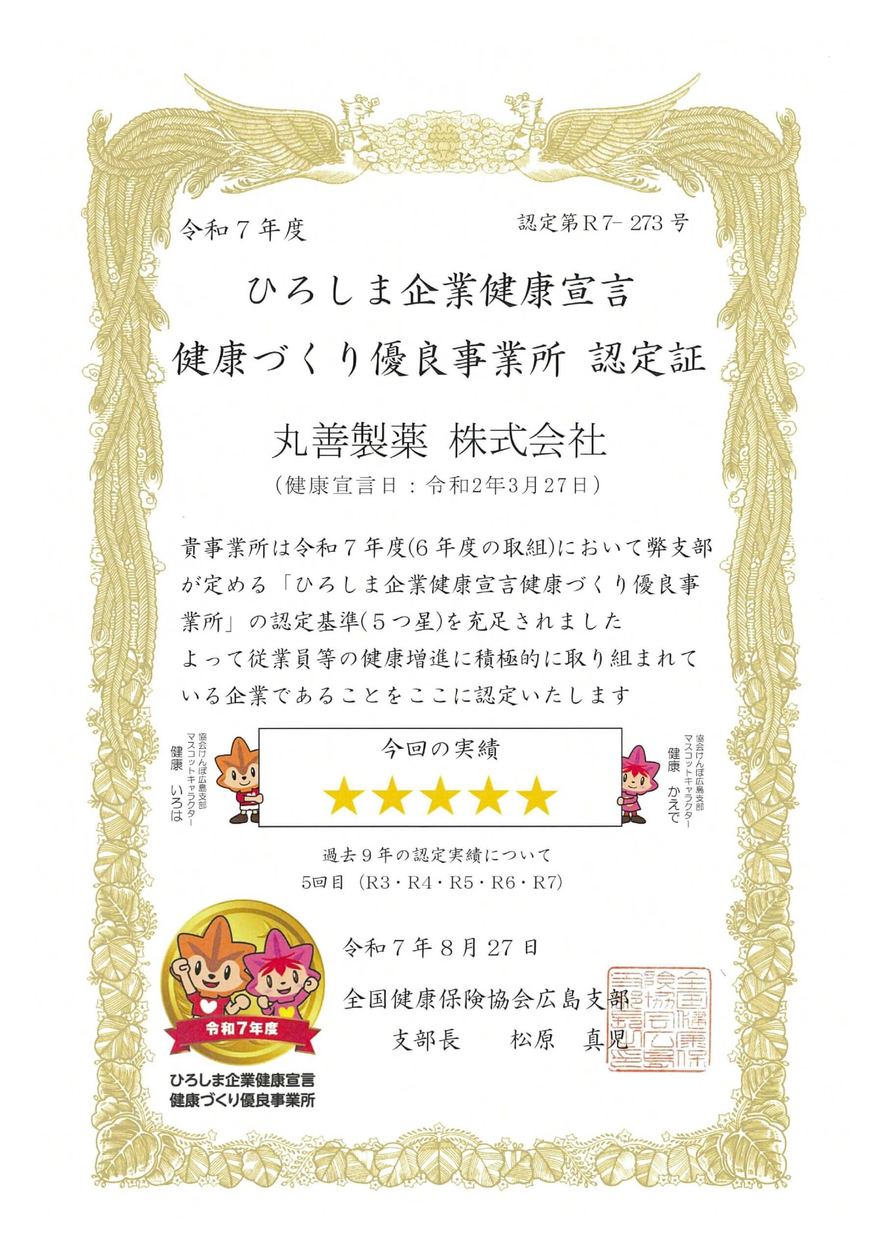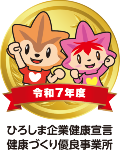 「ひろしま企業健康宣言健康づくり優良事業所」として、健康増進に積極的に取り組んでいる企業として、令和7年度において5年連続で認定を受けることができました。今後も社員が心身ともにより健康で働くことができる環境づくりを目指し、健康経営を推進してまいります。